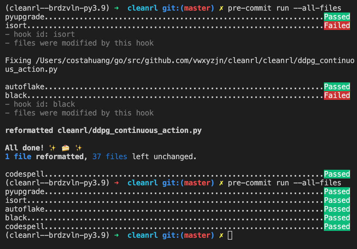 • poetry shell: First, activate the poetry's virtual environment by executing poetry shell. Then, the name of the poetry's virtual environment (e.g. (cleanrl-ghSZGHE3-py3.9)) should appear in the left side of your shell. Afterwards, you can directly run
